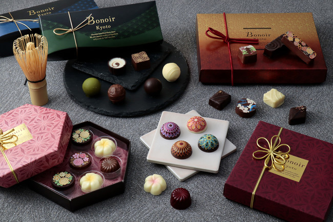スティック型のショコラや、花柄、紅葉、日本の象徴をあしらったショコラなど、様々な形で京都の魅力を表現した華やかなアソートです。