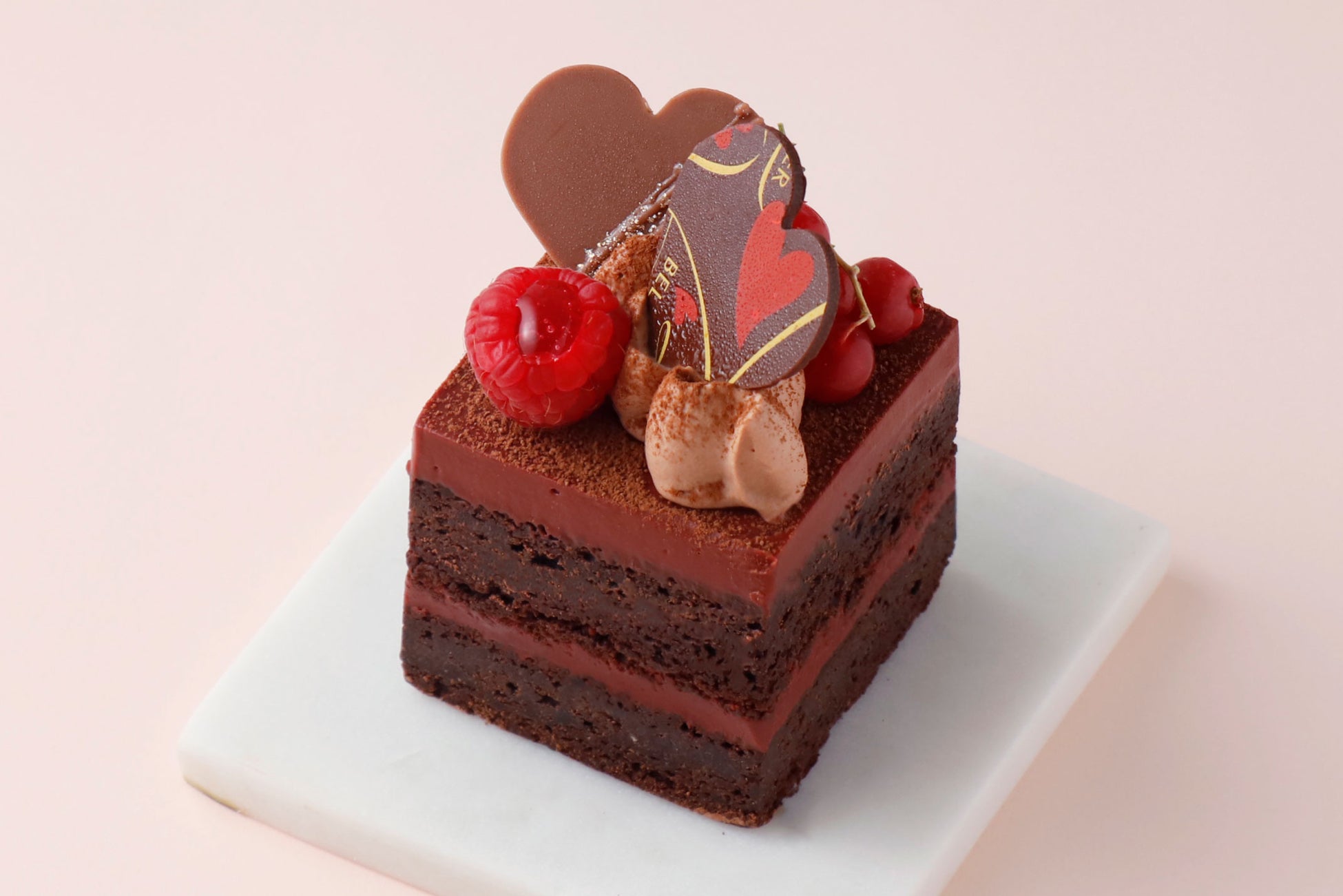 しっとりと焼き上げたショコラ生地に甘酸っぱいフランボワーズのガナッシュをサンドし、ハート型チョコとベリーをトッピングしました。