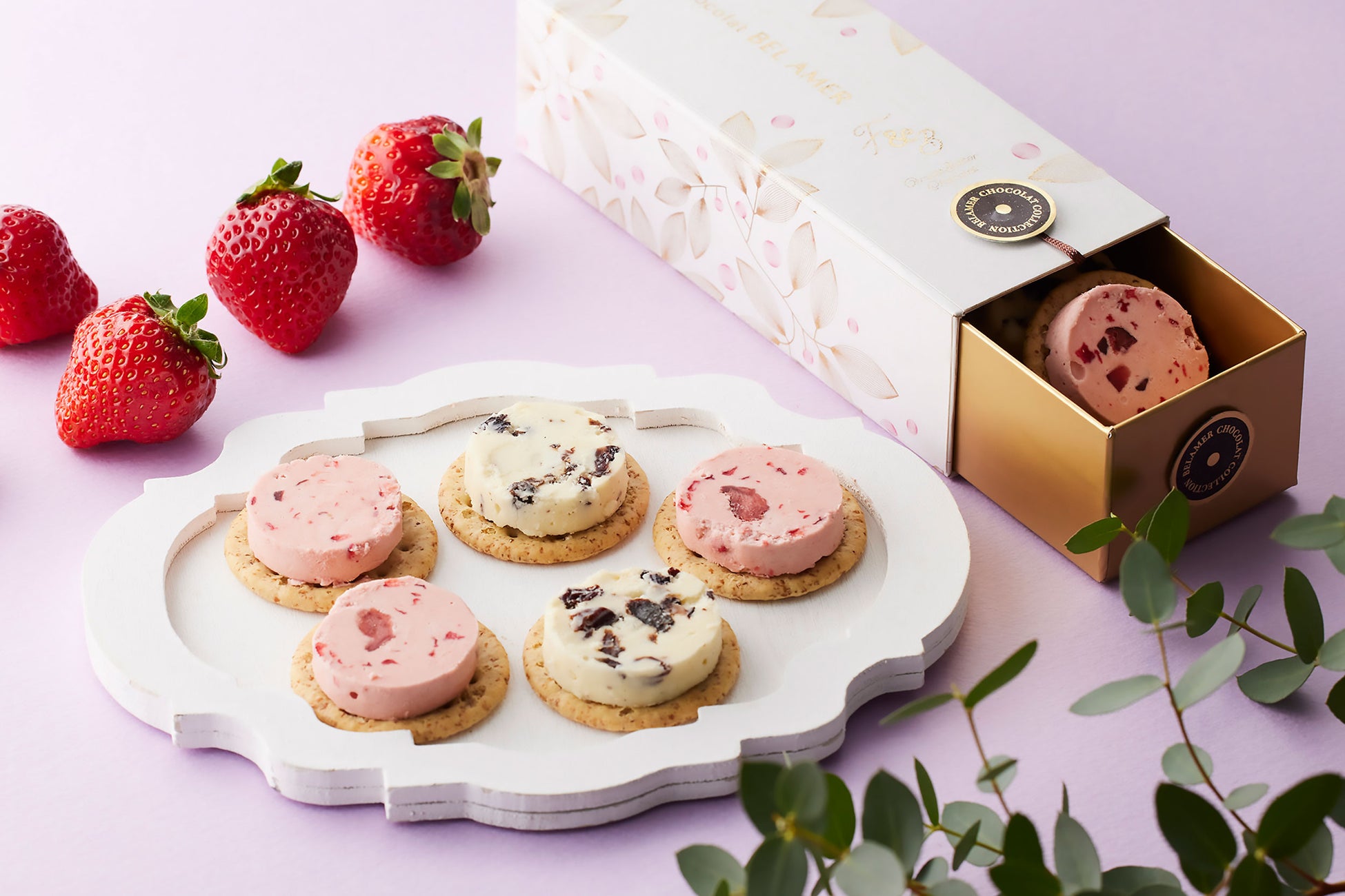 苺をテーマにした5種類のボンボンショコラはピューレやペースト、自家製のドライ苺など様々な形で苺を取り入れました。甘酸っぱい苺とショコラのマリアージュを存分にお楽しみいただけます。