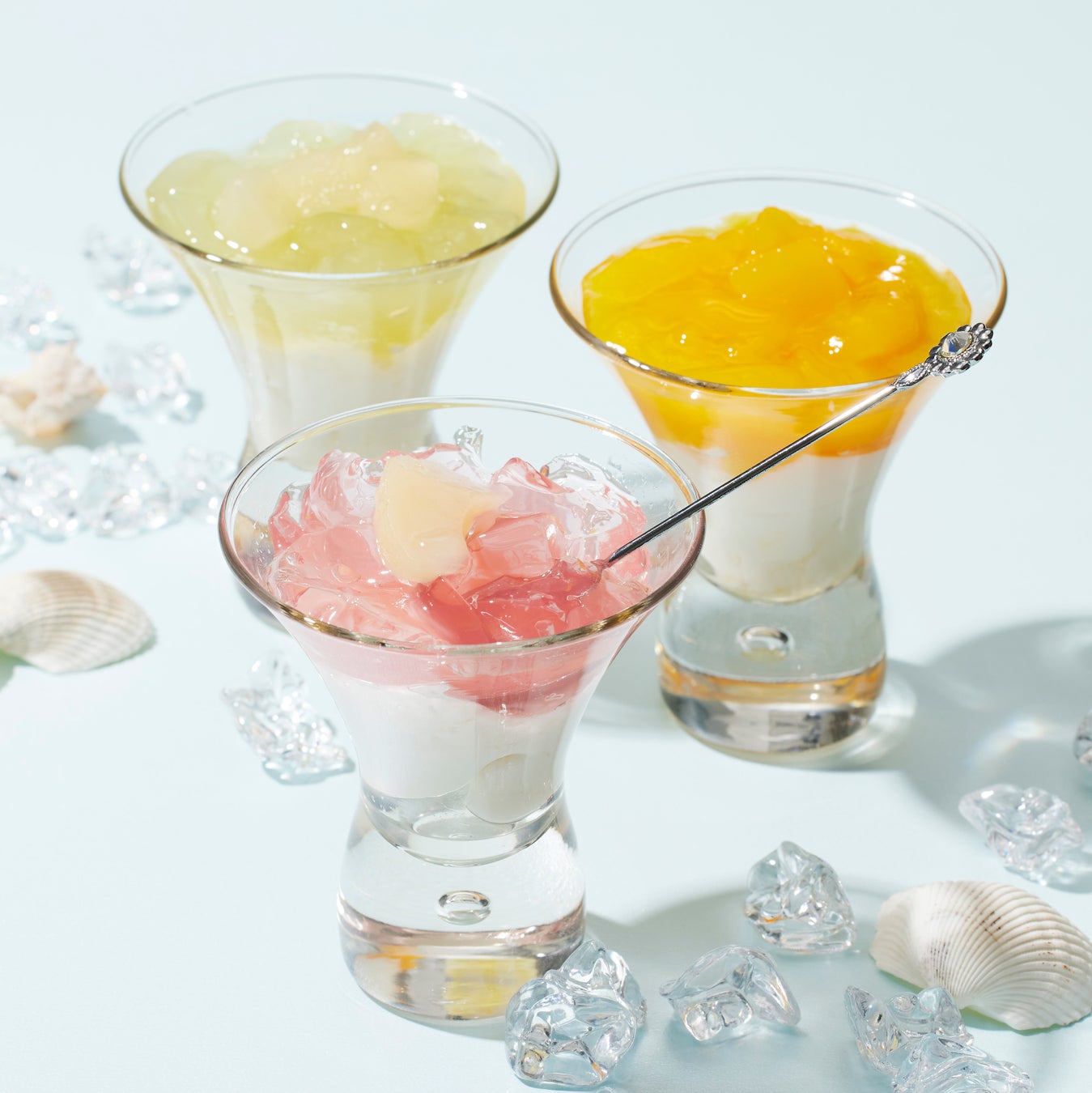 マンゴー、ピーチ、洋梨を使用した喉越しの良いさっぱりとした味わいのブランマンジェが出来上がりました。コクのある北海道ミルクのブランマンジェと爽やかなフルーツゼリーの酸味が口いっぱいに広がります。