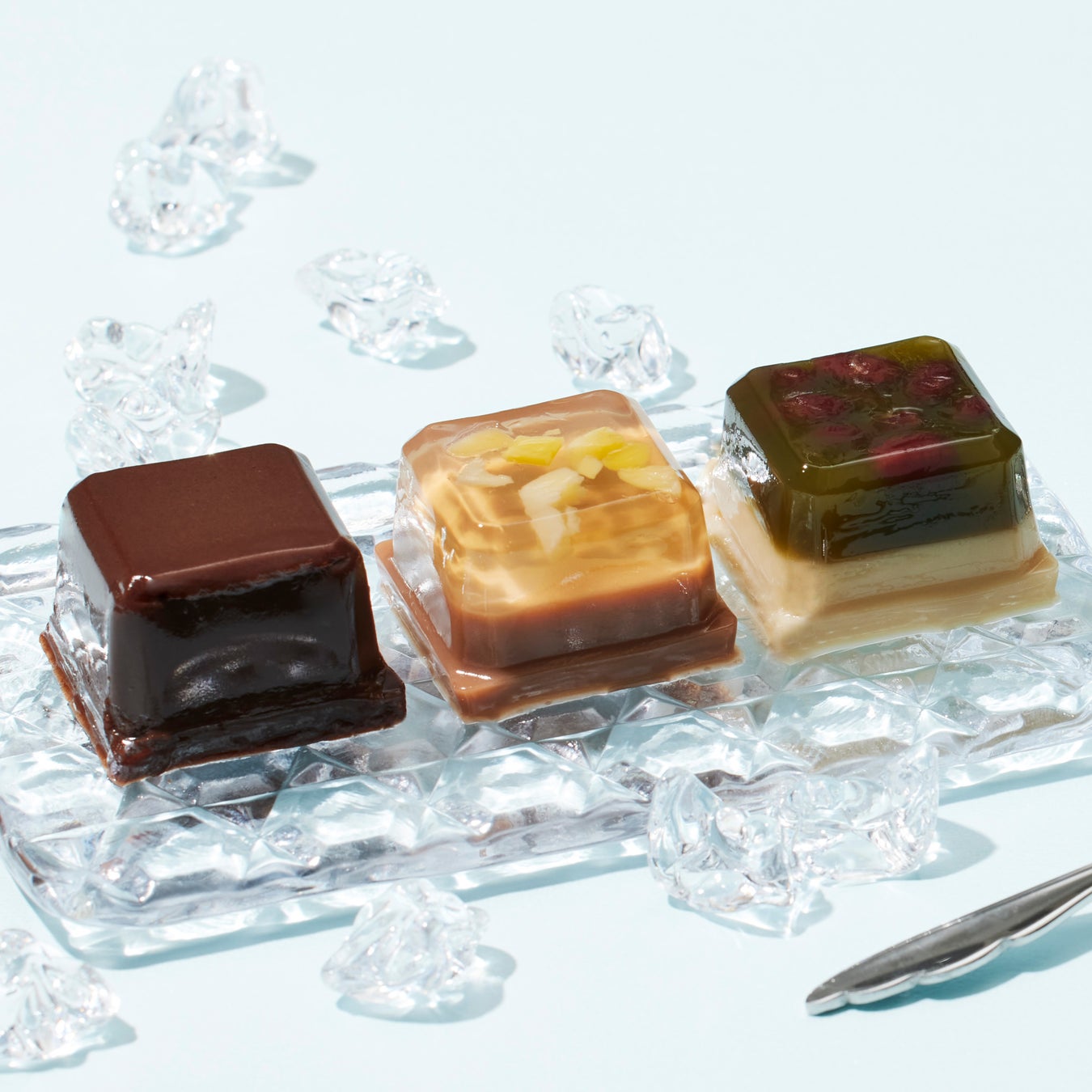 しっかりとチョコレート感のあるビターチョコの羊羹を合わせた”餡ビター”、和栗とマイルドなミルクチョコの羊羹を合わせた”ミルクチョコ和栗”、あずき入りのほろ苦い抹茶ゼリーとミルキーなホワイトチョコ羊羹を合わせた”抹茶あずきミルク”の3種をアソート。