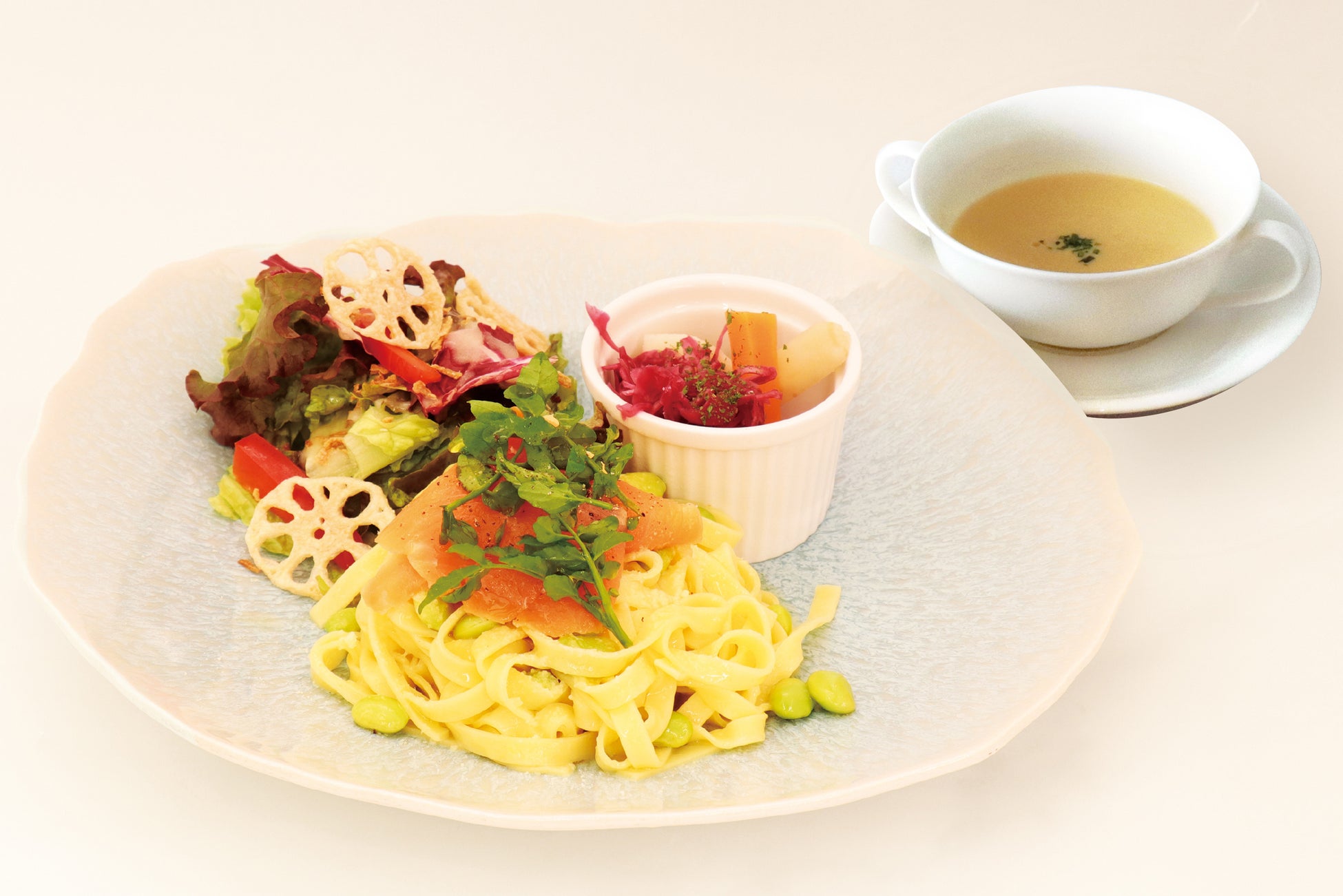 スモークサーモンと枝豆を加えた、 爽やかなレモン風味のパスタです。