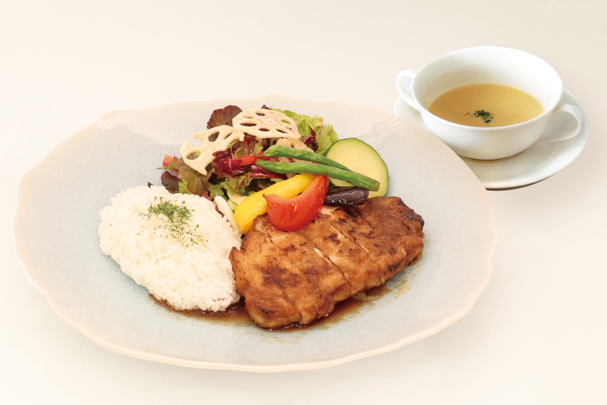 国産豚ロース肉を香ばしく焼き上げ、 こだわりのジンジャーソースをメインにライスとサラダを盛り付けました。
