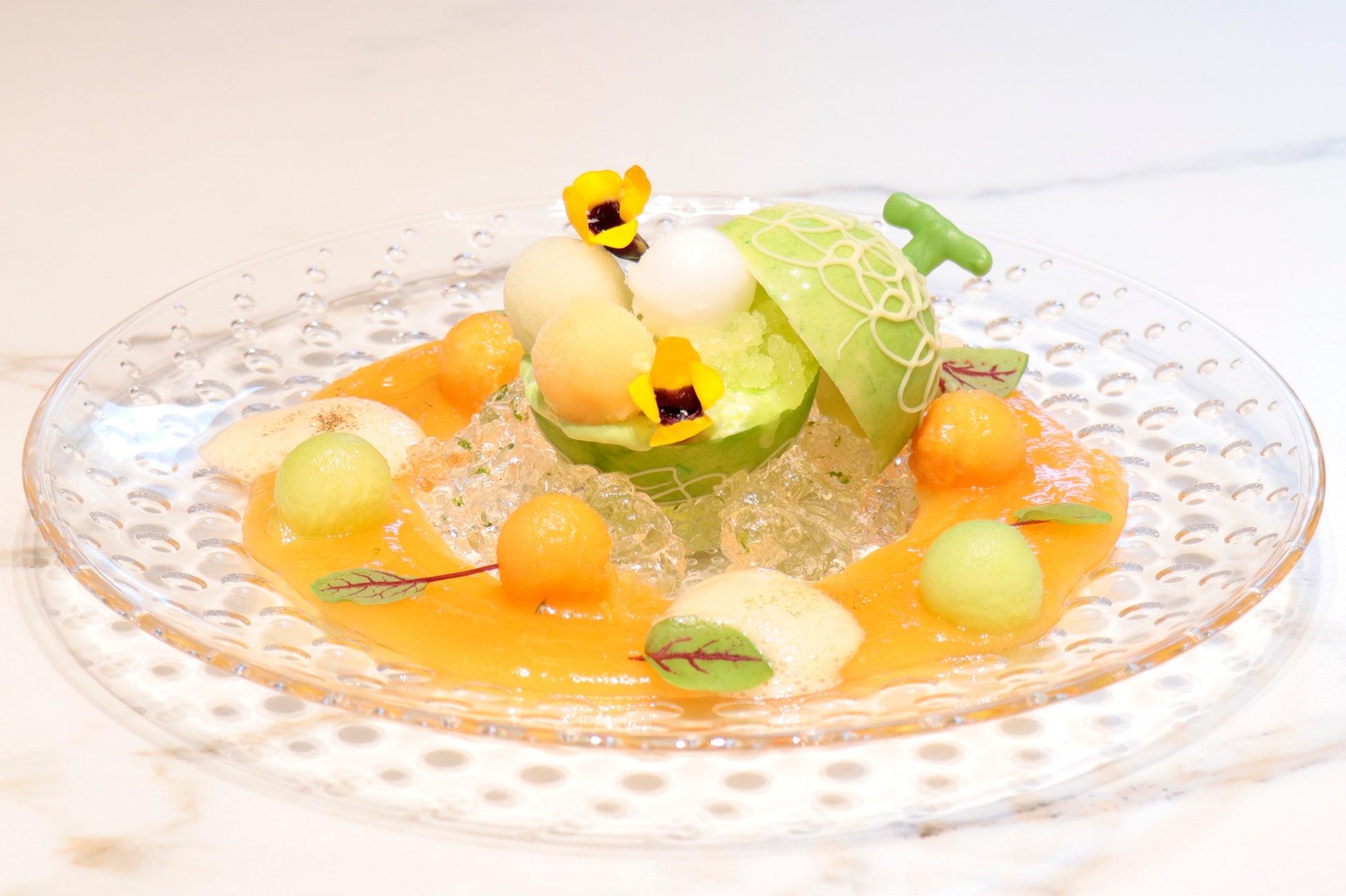 メロンの形のチョコカップの中にはメロンのソース、クリーム、ソルベ、グラニテなどメロンを使った様々なパーツを盛り込みました。