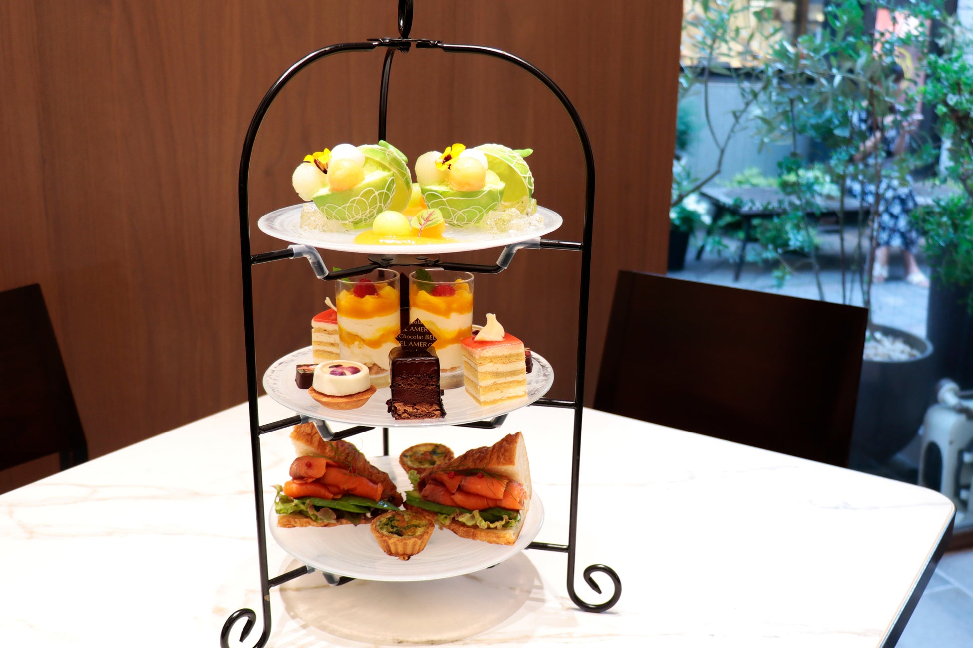 上段には季節のデセール「ショコラメロン」、中段にはショコラノワール、桃のガトー、エルダーフラワーのタルト、マンゴーのヴェリーヌ、ボンボンショコラ、下段にはサンドイッチやミニキッシュを盛り合わせました。