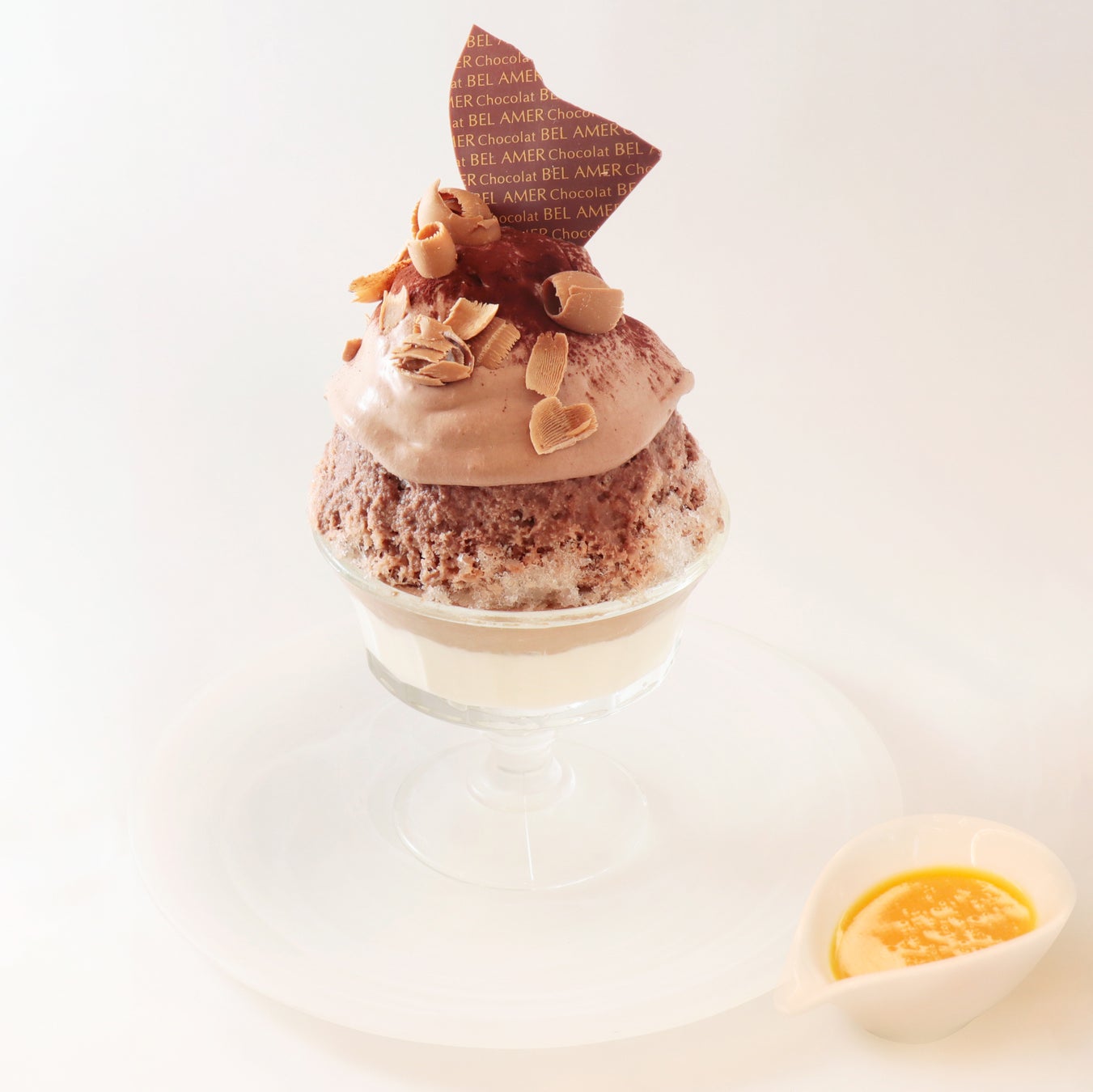 氷の上にベルアメールオリジナルのクーベルチュールを使ったショコラクリームをのせ、中にはショコラアイス、生クリーム、アクセントにオレンジを忍ばせています。