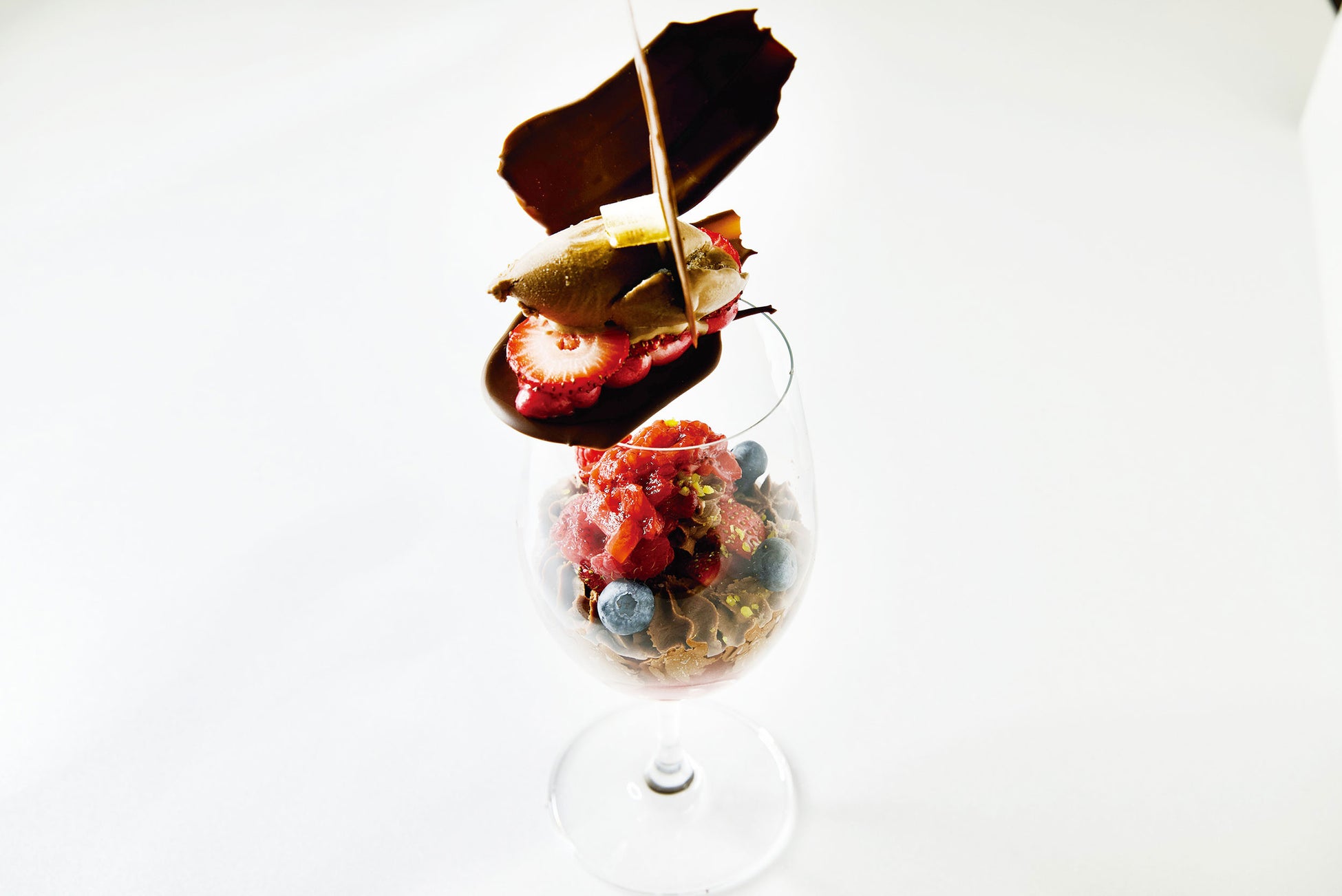チョコレートの様々なテクスチャーとベリーの爽やかな酸味を楽しめるパフェです。
