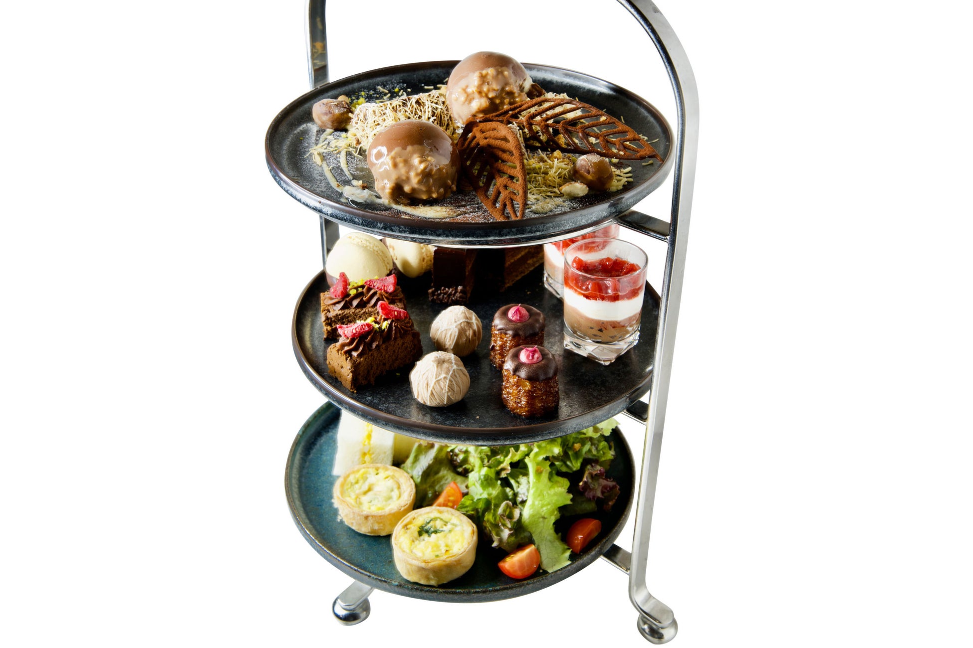 キッシュ、サンドイッチ、ボンボンショコラなど、様々な味が楽しめるアフタヌーンティーセットです。