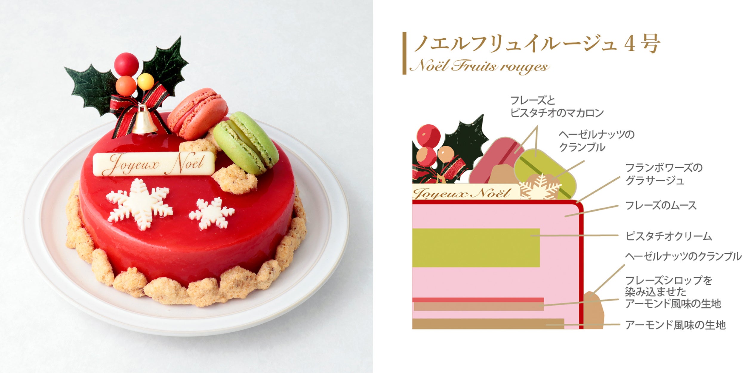 仕上げに苺とピスタチオのマカロンとヘーゼルナッツのクランブル、雪の結晶をモチーフにしたホワイトチョコレートなどのデコレーションを施しました。