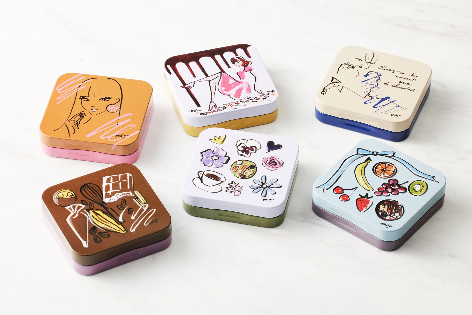 ショコラをテーマにしたもの、フルーツをテーマにしたものなど、見ているだけでわくわくする6種類のデザイン缶。