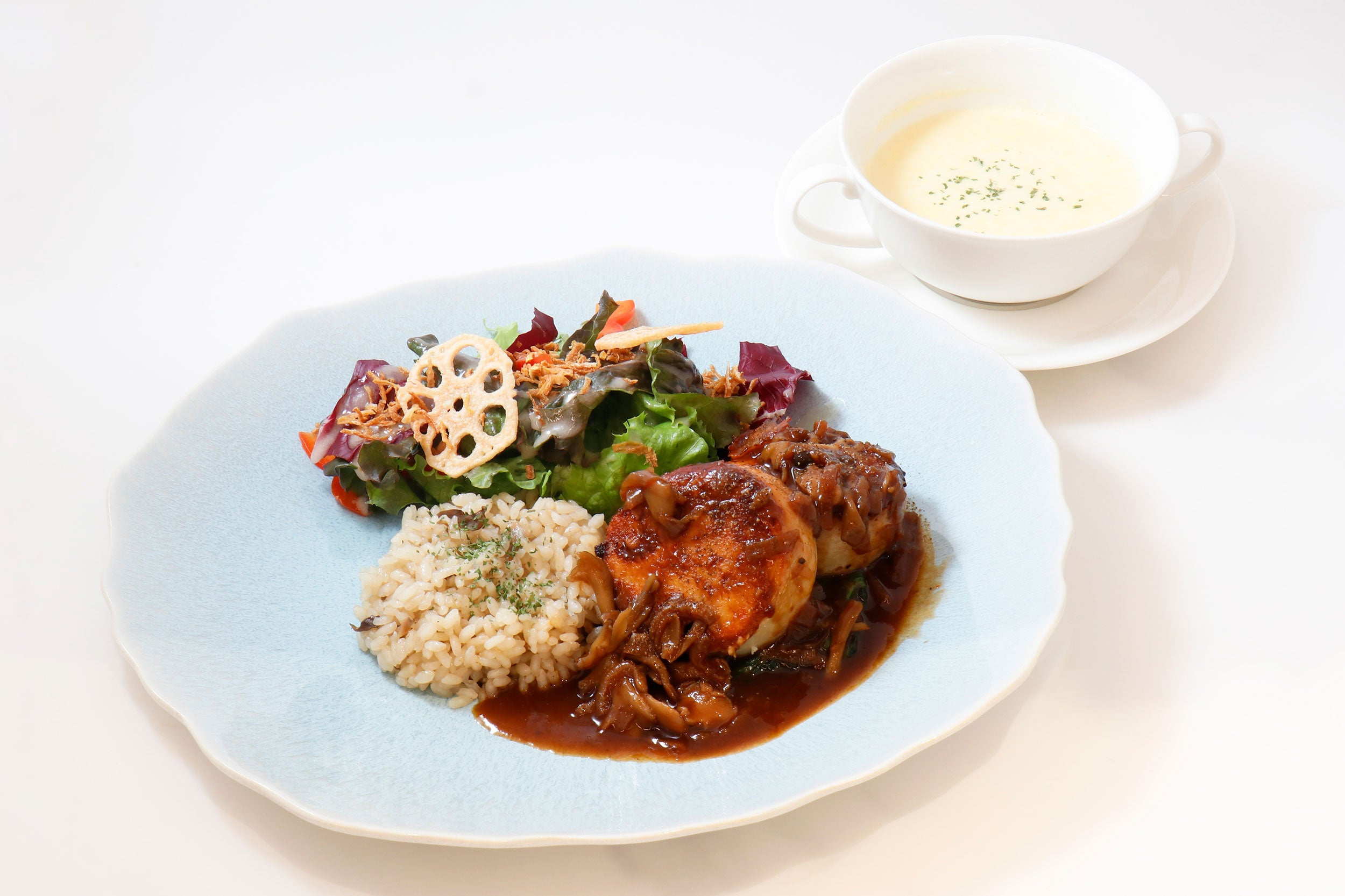キノコを加えた香り高い赤ワインソースで仕上げ、キノコピラフ、サラダ、季節のスープを添えました。
