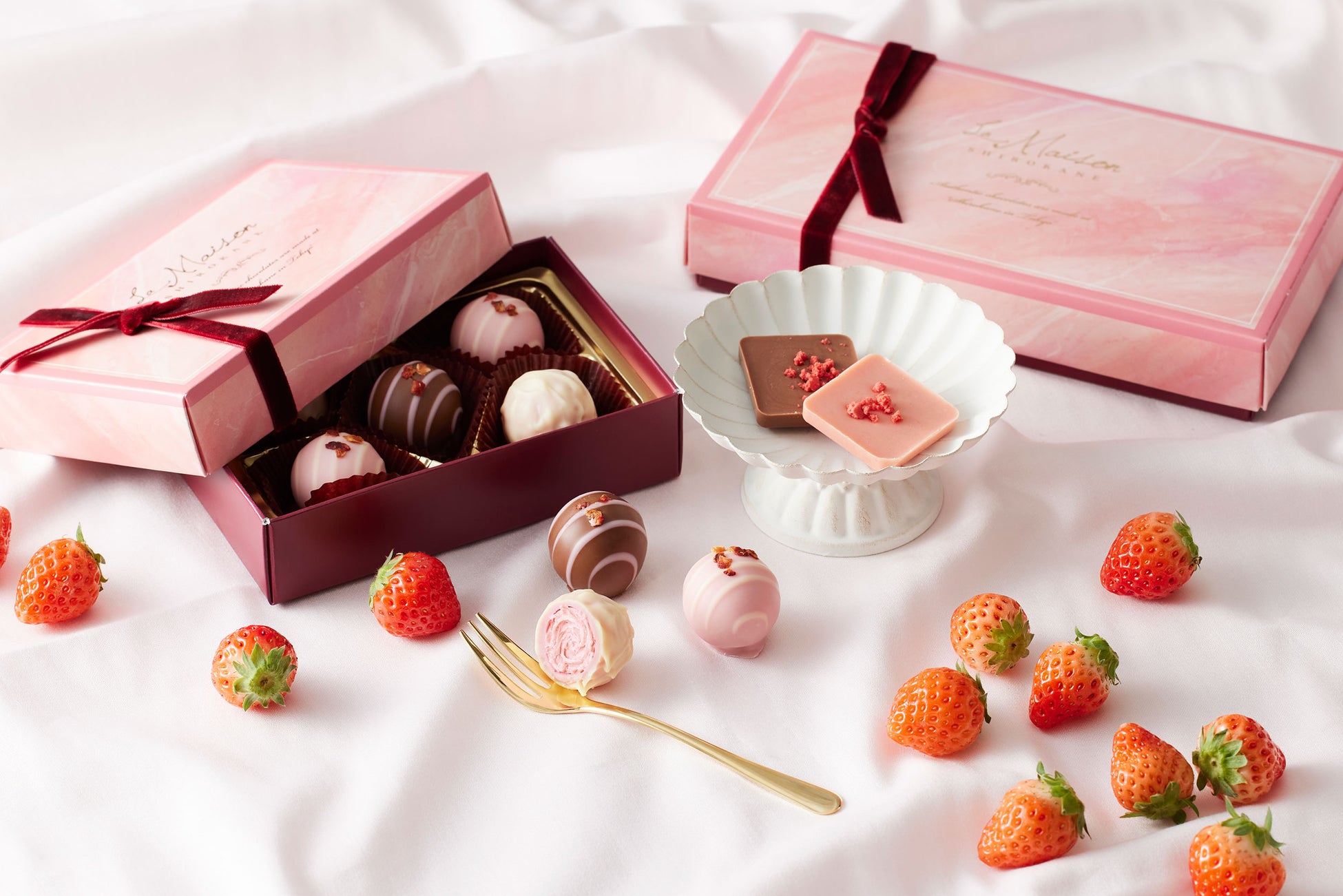 バニラ、ミルクチョコ、ホワイトチョコとあまおう苺を掛け合わせた、口どけなめらかなトリュフ、あまおう苺風味のチョコにストロベリー顆粒をのせた華やかなキャレショコラなど、あまおう苺とショコラの美味しさを存分にお楽しみいただける詰め合わせです。