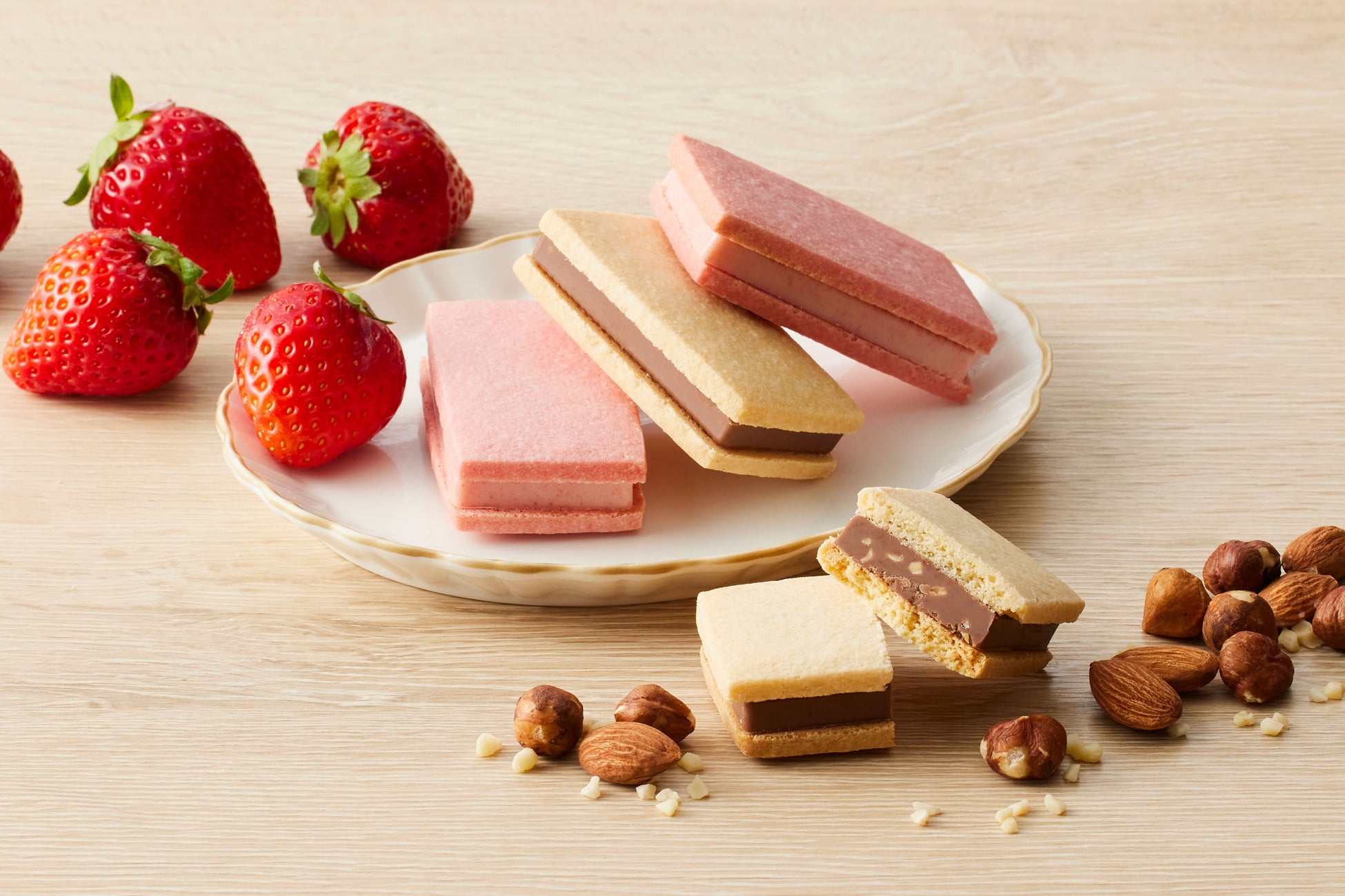 この春からは、あまおう苺風味のショコラをクッキーでサンドした「あまおう苺」、ヘーゼルナッツ風味のアーモンド入りショコラをクッキーでサンド「ヘーゼルナッツ&アーモンド」の2種が新たに加わります。