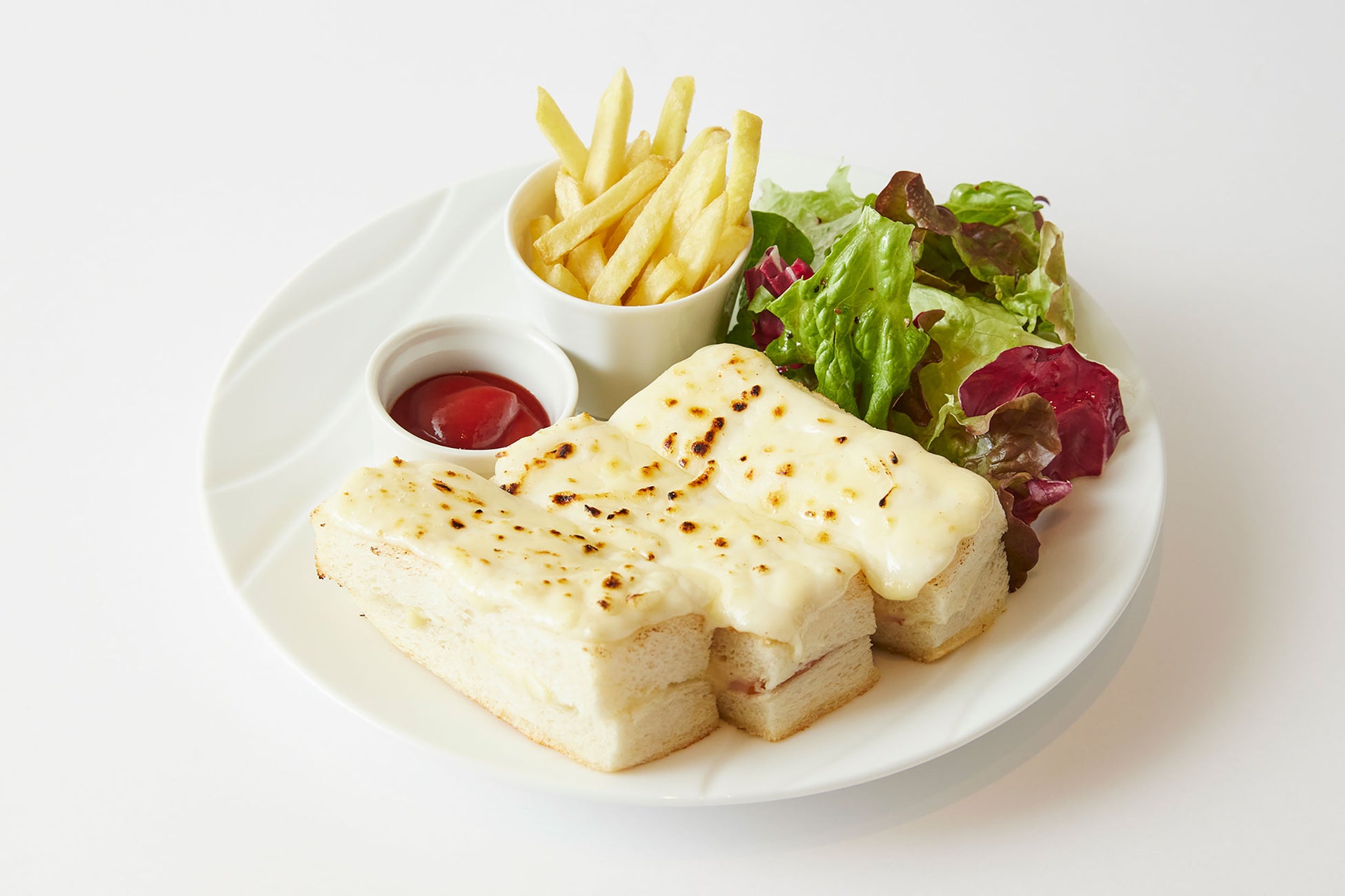 食パンにハムとチーズをはさみ、ベシャメルソースとチーズを乗せ香ばしく焼いた濃厚な味わいのクロックムッシュです。