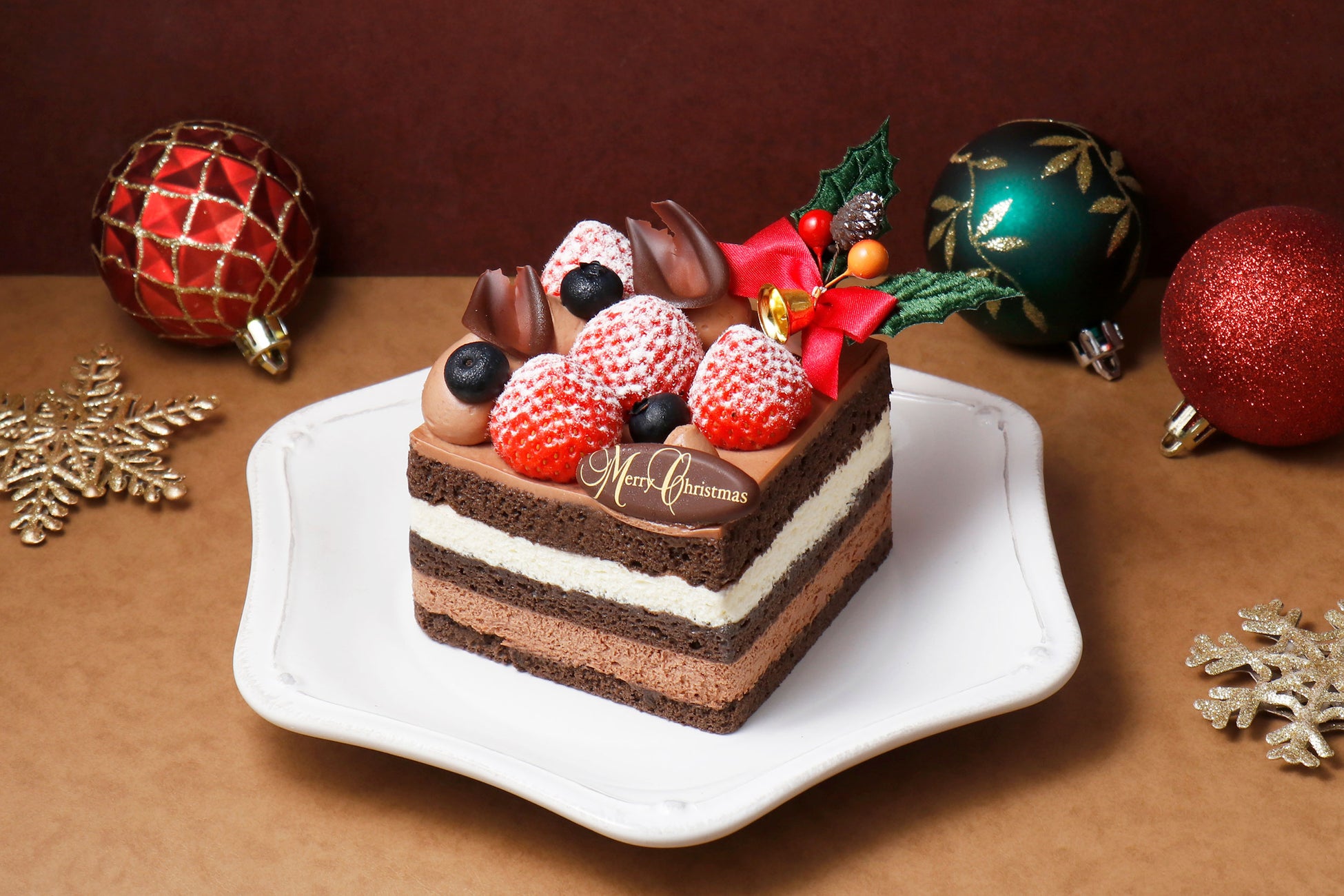 ケーキをカットした際に現れる緑と赤の美しいクリスマスカラーにこだわり仕上げた、なめらかなくちどけのショコラムース。